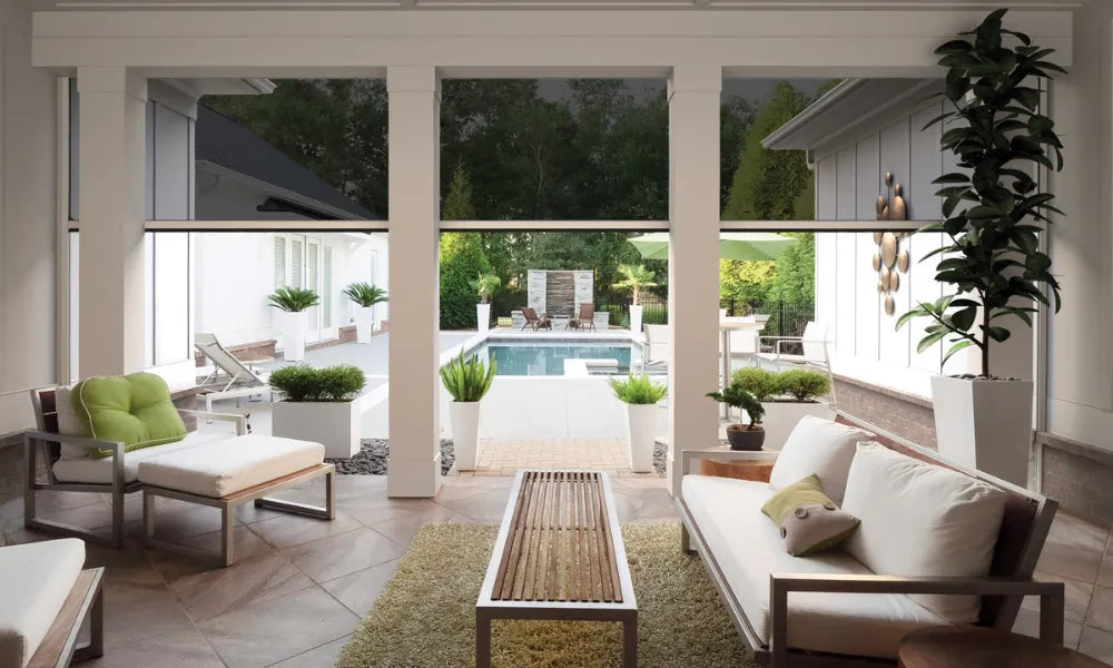 Upgrade your indoor and outdoor spaces with motorized patio and garage screens, designed for comfort and protection. These versatile screens keep bugs out, reduce harsh summer sunlight, and help retain warmth in colder months; ideal for transforming garages into home offices, play areas, or gyms!